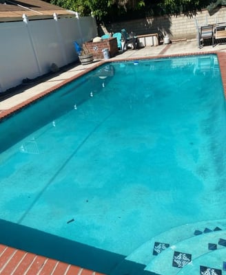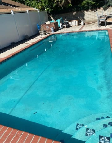 I told the customers I would be able to clear up the pool without needing an Acid wash. It was going to take some time, but I was confident it could be done. That day I shocked the pool. The next day I came back (picture below) and it had already started to get back to normal. It took about a week from start to finish.